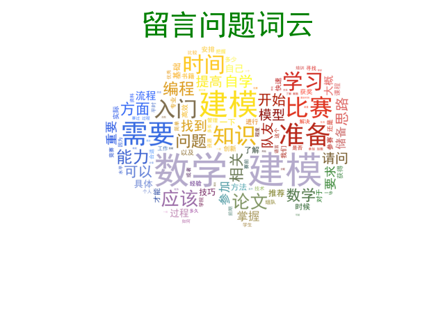 大会开始后,主持人先将大家所关心的焦点问题提炼成词云图,直观地呈现在主讲同学面前。随后,王佳宇、宋志翔、欧炜庭、纪量、张荣德、贾林瀚、徐勐、谢子怡、任奕璇等九位曾在国赛或美赛中获奖的同学上台针对性地分享建模经验。这些同学来自多个公司,他们用独特的观点分享了自己的经历并提出多项可行建议。