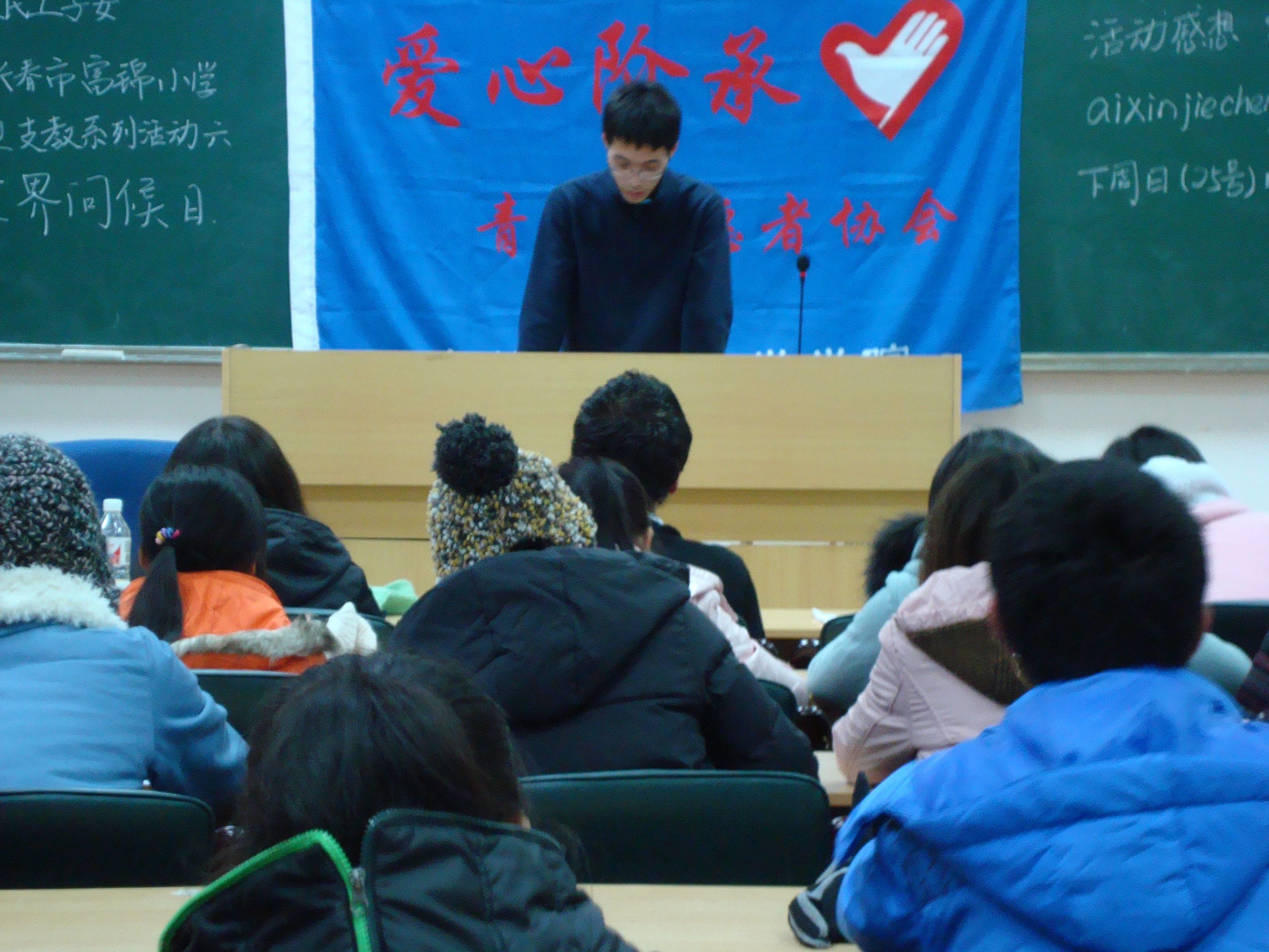 2012年11月15日晚6点,伟德国际1946爱心阶承青年志愿者协会在数学楼一楼报告厅举办了“走进长春市富锦小学--大型支教活动”系列之第六届“世界问候日”主题活动的志愿者培训。