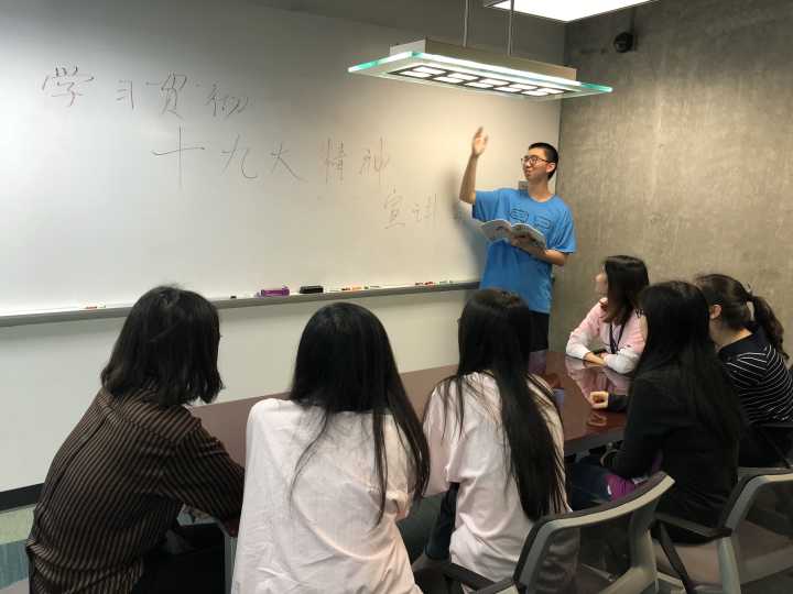 在此次活动中,同学们精心准备,积极参与讨论,为国外师生带来十九大的最新内涵。在2018年2月15日举行的宣讲会中,同学们由“举什么旗?走什么路?”引入,从哲学的角度,着重讲解了“革命的实现需要理论引导;时代的发展需要理论改变;不朽的理论需要自我完善”三个方面的内容,最后,以十九大主题“不忘初心,牢记使命,高举中国特色社会主义伟大旗帜,决胜全面建成小康社会,夺取新时代中国特色社会主义伟大胜利,为实现中华民族伟大复兴的中国梦不懈奋斗。”作总结,对党的十九大报告进行了深入的解读和阐释。在读书会与研讨会中,同学们结合习近平总书记最新讲话精神,内容丰富,妙语不断,展现新一代青年的雄思博辩,才思敏捷。