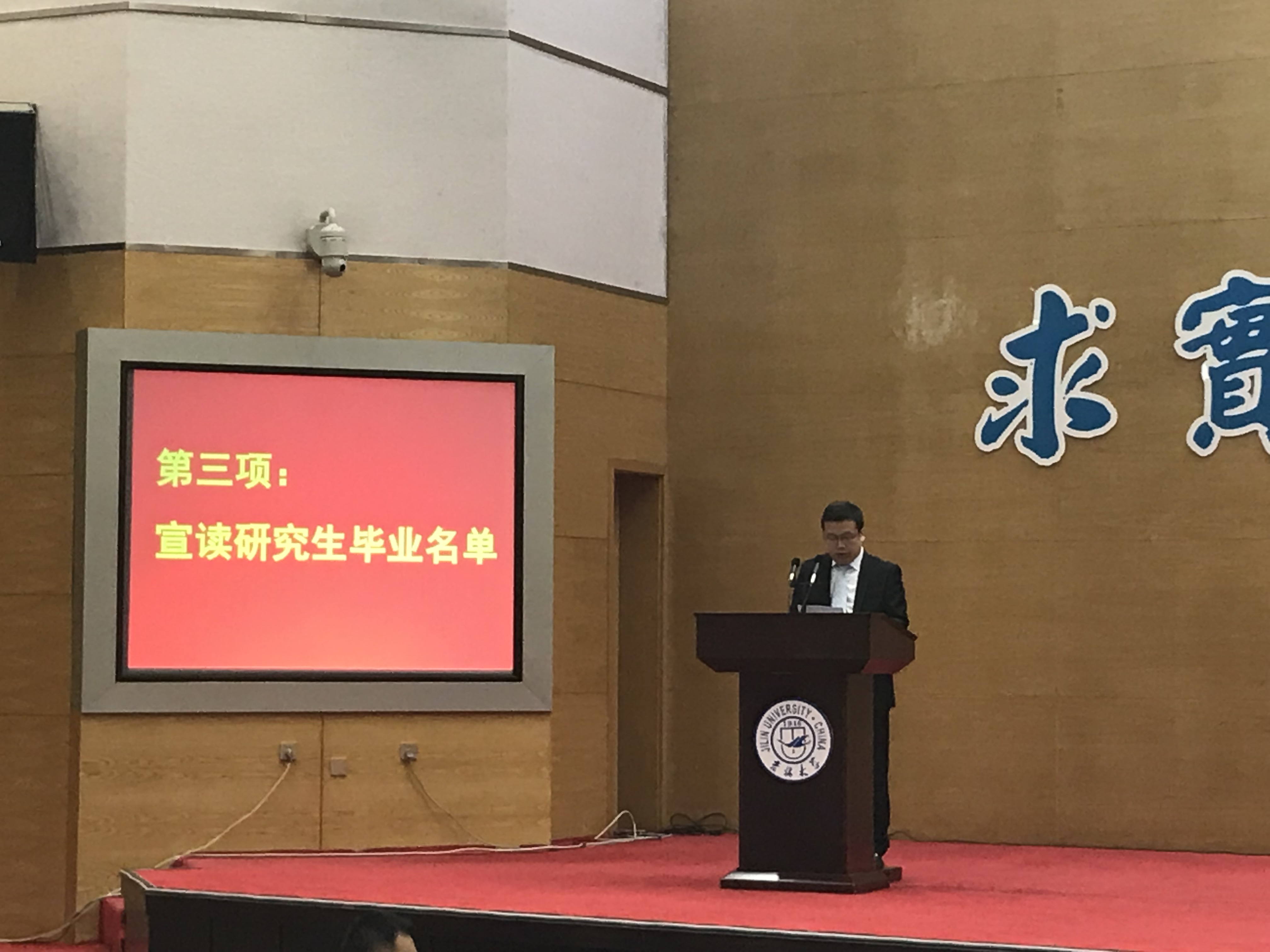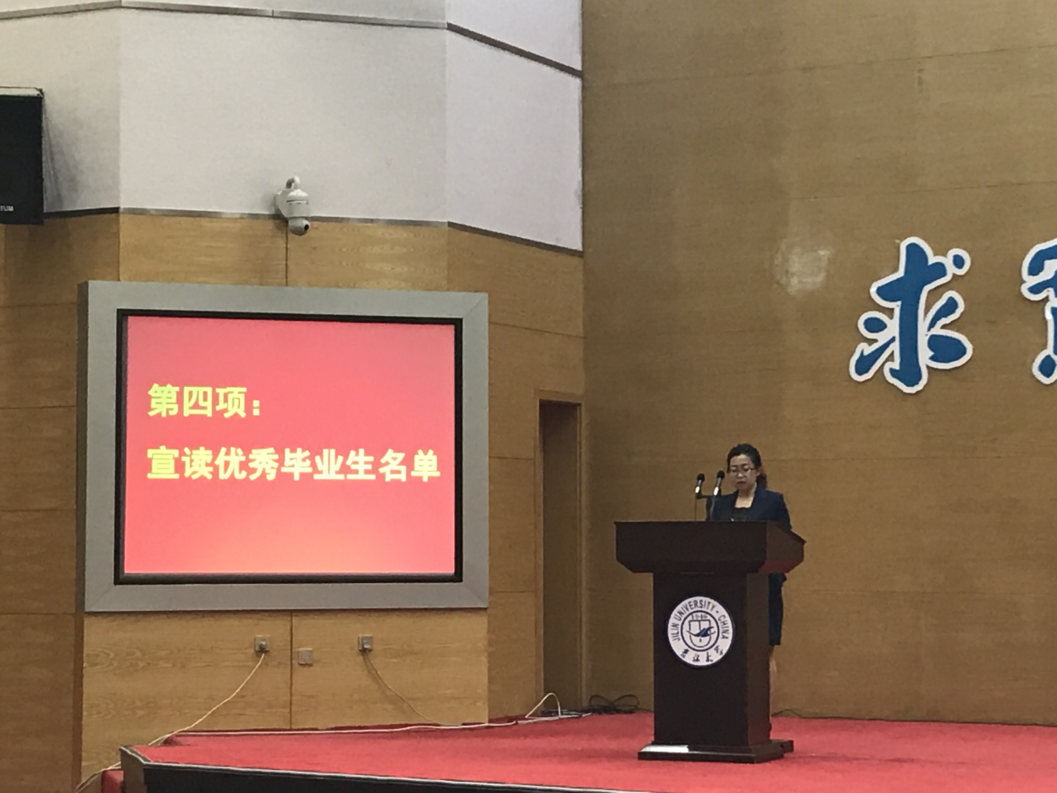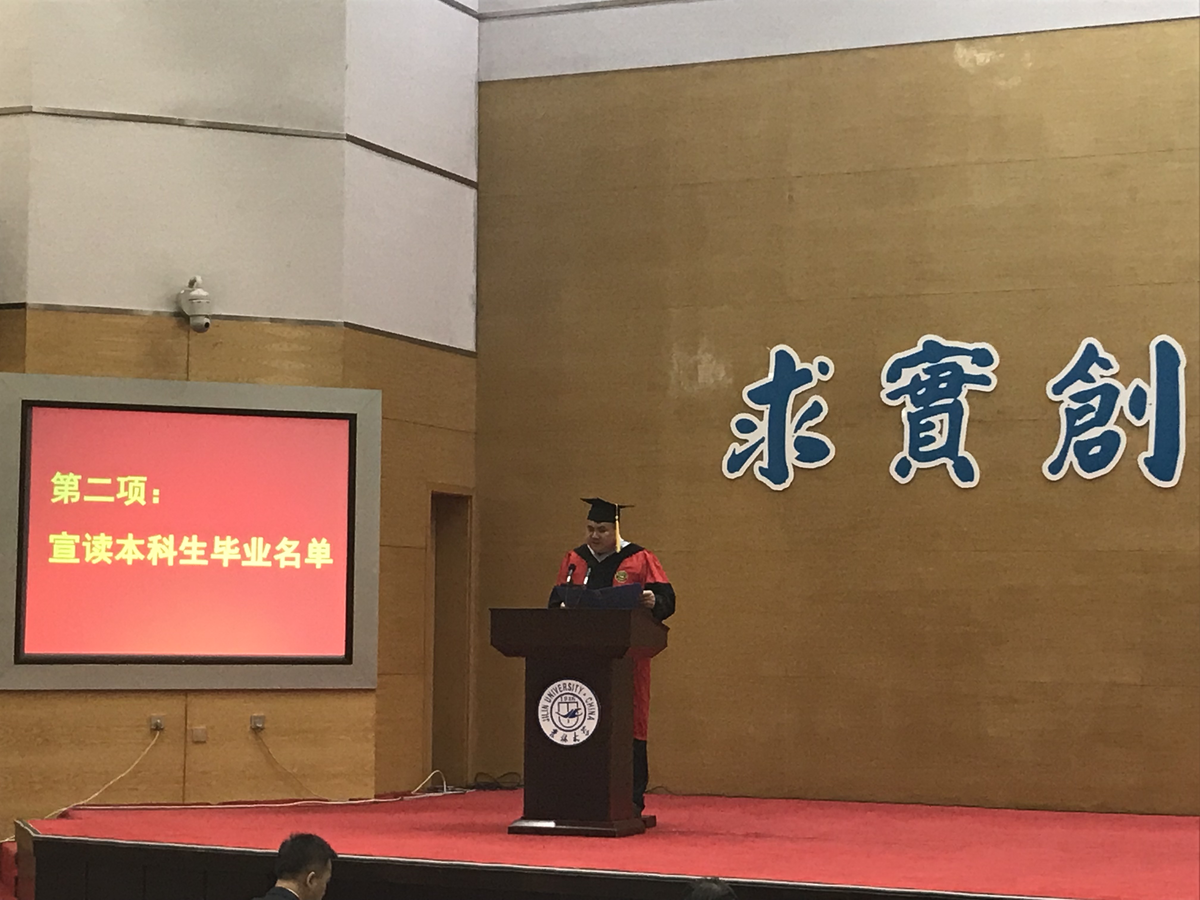 大会首先由副经理王德辉教授和史少云教授老师分别宣读了获得学士学位、硕士学位以及博士学位的毕业生名单。接着,党委副书记王欢老师宣读2018届优秀毕业生表彰决定,并党委书记李晓光教授为获奖代表颁发证书。