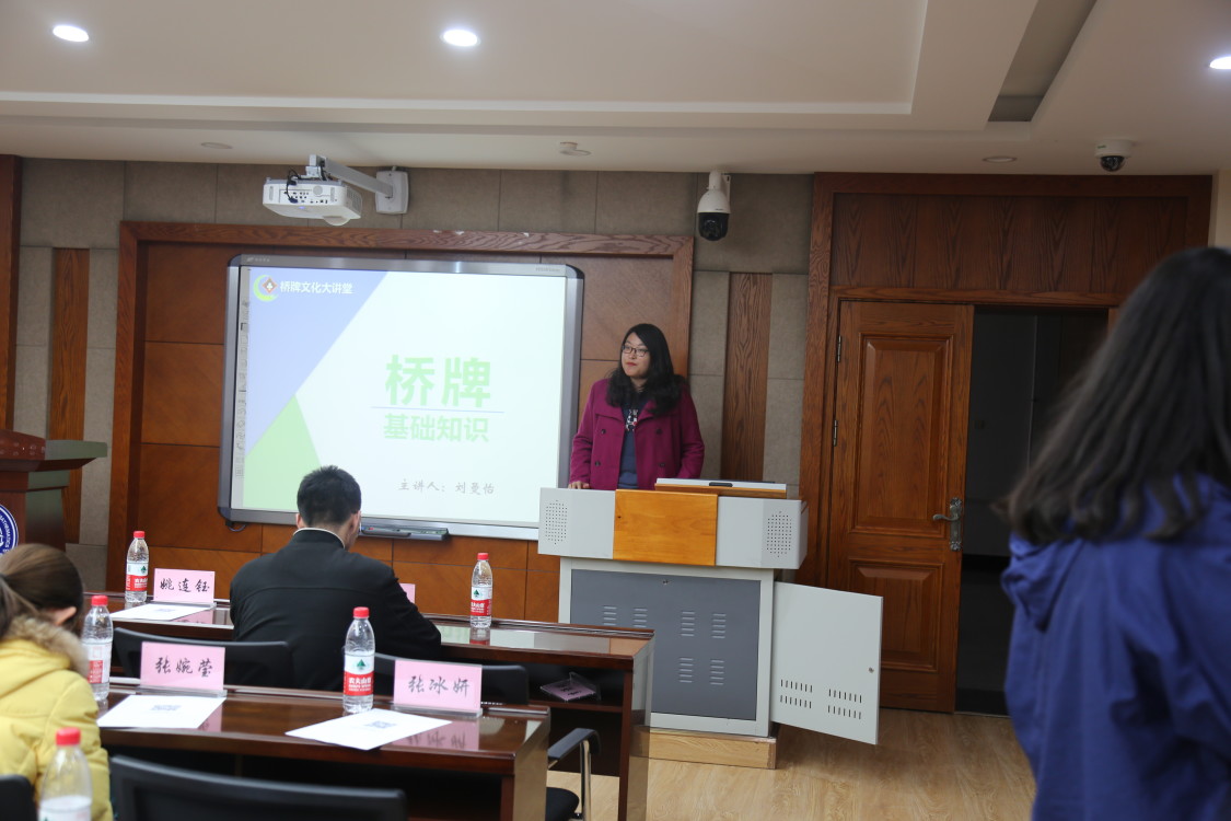 首先,由永和桥牌社社长李子钰同学为我们简单的介绍了桥牌是什么,桥牌为什么受欢迎,玩桥牌的好处以及桥牌在吉大的发展等等。同时,李子钰同学与台下同学们提问互动,台下同学们积极回答问题。然后,由伟德国际1946团委副书记兼社团联合会主席赵雯晗为吉林省桥牌协会颁发特殊贡献单位奖,员工会主席邱韵为长春市桥牌协会颁发特殊贡献单位奖,由团委副书记李潇琦为刘曼怡颁发特殊贡献个人奖。再接着,资深桥牌达人刘曼怡为我们讲解了基础桥牌知识,桥牌到底该怎么玩。刘曼怡为我们到场的每个人都布置了在线桥牌练习,大家也都纷纷拿起手机下载app,然后开始试玩。刘曼怡带着台下的同学们分析每个练习的出牌策略,让我们从对桥牌的一无所知到成为入门新手。