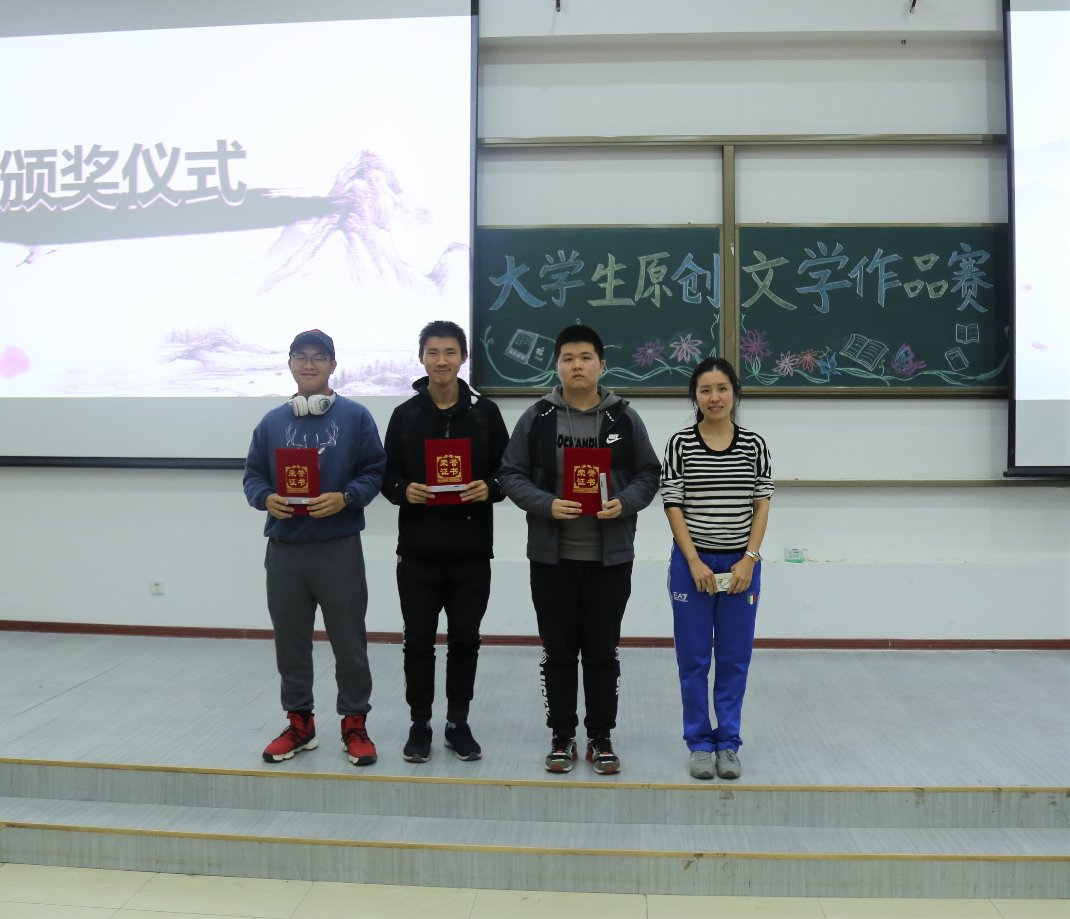 活动至此,评委老师们离开主会场,前往分会场为同学们的作品进行打分。评委老师在细细地品读了参赛选手的作品,对其慎重地给出了自己的判断。评阅过程中,老师们对选手的作品互相发表了自己的见解,对于同学们文学创作的能力给予了充分的肯定,并对部分二轮参赛作品表达了高度的赞扬与欣赏。与此同时,活动主会场进行了文学小常识问答,现场同学积极参与,主持人也对各个问题进行了不同程度的扩展,既丰富了同学们的文学知识,又很好地培养了同学们对于文学的兴趣。在文学小常识问答环节途中,还有不少参赛选手上台与同学们分享了自己的创作灵感以及自身对于文学的一些独到的见解。此外,伟德国际1946员工会副主席王锴强也上台同大家一起分享了自己对文学与数学两者相通性的一些看法。经过评委老师对第二轮比赛作品的打分,结合第一轮的得分情况,在激烈的角逐之后,主持人公布了此次原创文学作品大赛的最终结果。其中,向小吉荣获伟德国际1946老员工原创文学作品大赛一等奖;苗睿、李懿函荣获伟德国际1946老员工原创文学作品大赛二等奖;李志强、王文聪、张炜煊荣获伟德国际1946老员工原创文学作品大赛三等奖;王鑫、陈广兴、李殊雨、郭涵、程凯、李晨筱荣获伟德国际1946老员工原创文学作品大赛优秀奖。伟德国际1946谢敬然老师、曹馨月老师、文公司李菲老师、文公司李明晖老师和文公司姜勇老师分别为获得优秀奖、三等奖、二等奖和一等奖的参赛同学颁奖,并与其一同合影。让我们向这些获奖选手送上真挚的祝贺,也感谢相关工作人员及评委老师的辛勤付出。本次老员工原创作品大赛圆满结束!