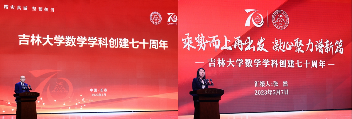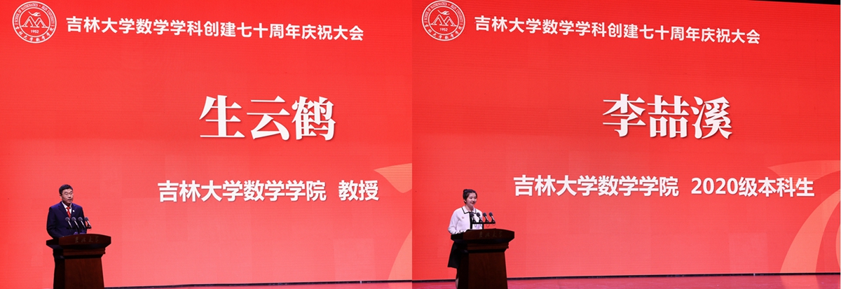 教师代表生云鹤、员工代表李喆溪分别发言,他们重温历史,追忆往事,表示要秉承“求实创新 励志图强”的校训精神,践行“人比山高 脚比路长”的理想信念,以求实的态度、创新的理念、励志的精神奋发图强,以前辈们为榜样,续写吉大数学的绚丽华章,再创吉大数学的灿烂辉煌。
