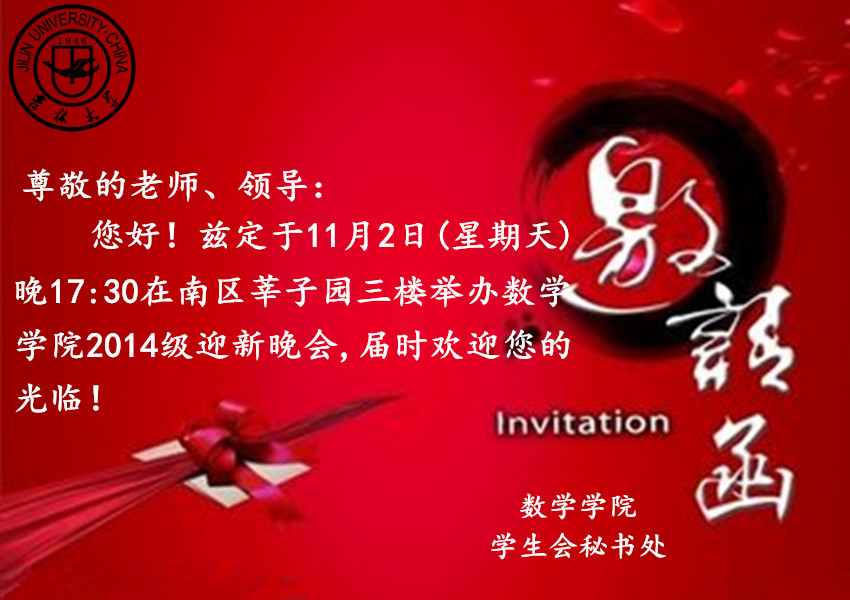 尊敬的老师、领导: 您好!兹定于11月2日(星期日)晚15:30分在南区莘子园三楼举办2014级迎新晚会,届时欢迎您的光临! 伟德国际1946员工会秘书处