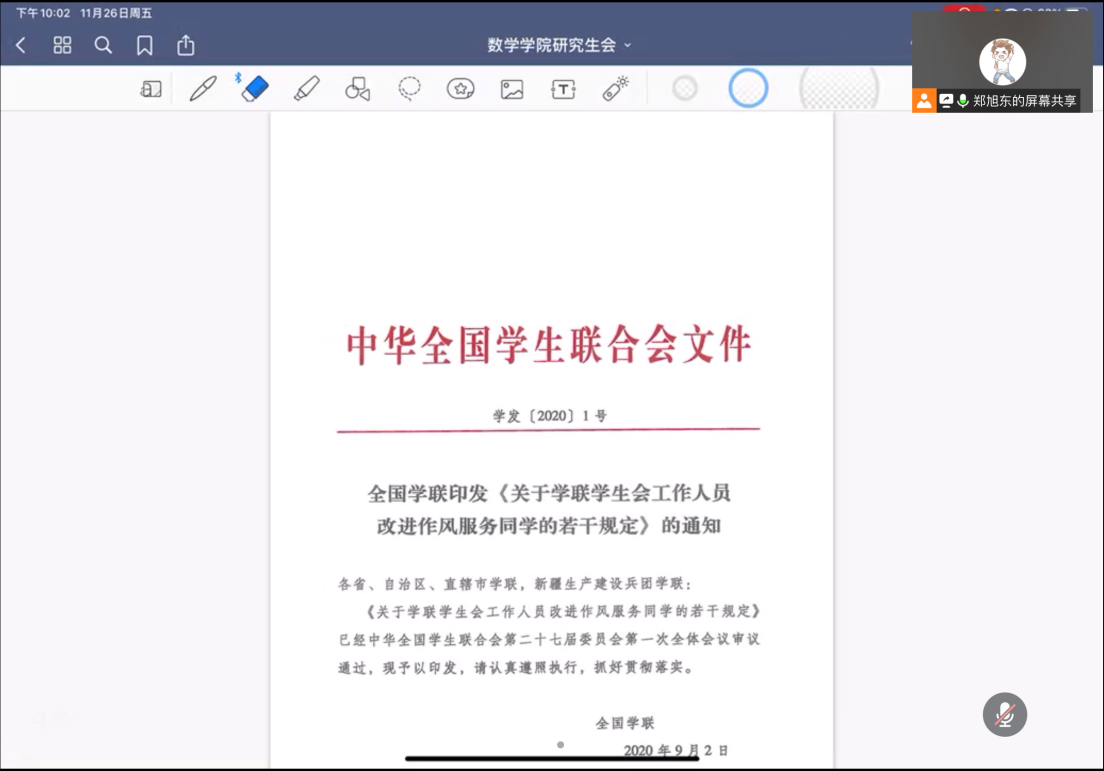为进一步加强公司研究生会队伍建设,切实发挥员工骨干在“自我管理、自我教育、自我服务”中的作用,培养和选拔一支“政治素质过硬、服务意识突出、工作态度优异、业务素质精湛”的研究生会工作人员队伍,11月26日,公司研究生会于线上举办了2021-2022学年秋季学期研究生会组织工作人员全员培训会暨党的十九届六中全会精神学习研讨会,公司研究生会执行主席郑旭东主持会议,公司研究生会全体成员出席会议。