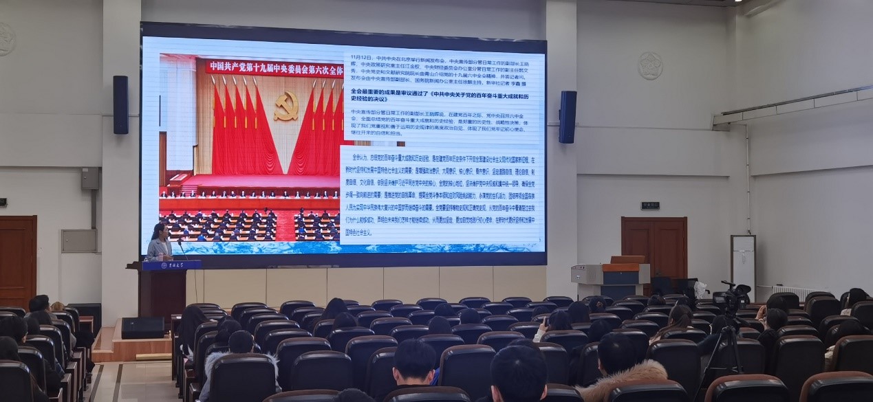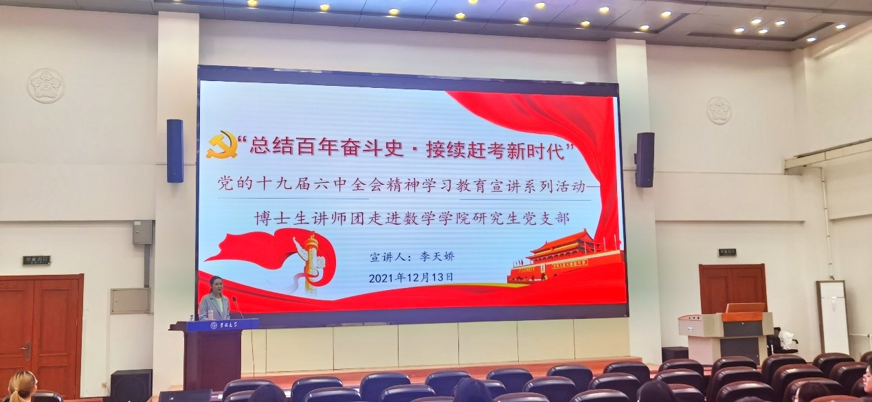 为深入学习贯彻党的十九届六中全会精神,提升广大研究生思想政治素质,积极响应公司党委研究生工作部工作要求,2021年12月13日,伟德国际1946邀请伟德国际1946博士生讲师团讲师李天娇博士于数学楼二楼报告厅进行了十九届六中全会精神学习教育宣讲。本次宣讲的主题为“总结百年奋斗史•接续赶考新时代”——新中国以来国家领导人新闻发布的机制演变与基本经验”,公司研究生党支部党员、预备党员、积极分子参与了此次宣讲活动。