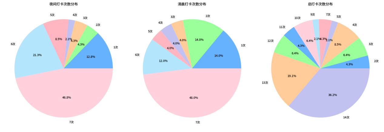 根据打卡数据统计,有超过半数的参与者坚持完成每日打卡,整体展现出良好的作息意识与自律性。从时间分布上看,晚间早睡打卡人数略多于清晨早起,显示出早起对部分员工而言更具挑战性。尽管线上数据无法完全反映实际作息,但仍为了解员工生活状态提供了重要参考,也进一步提醒我们应重视科学作息,合理安排学习与休息之间的平衡。