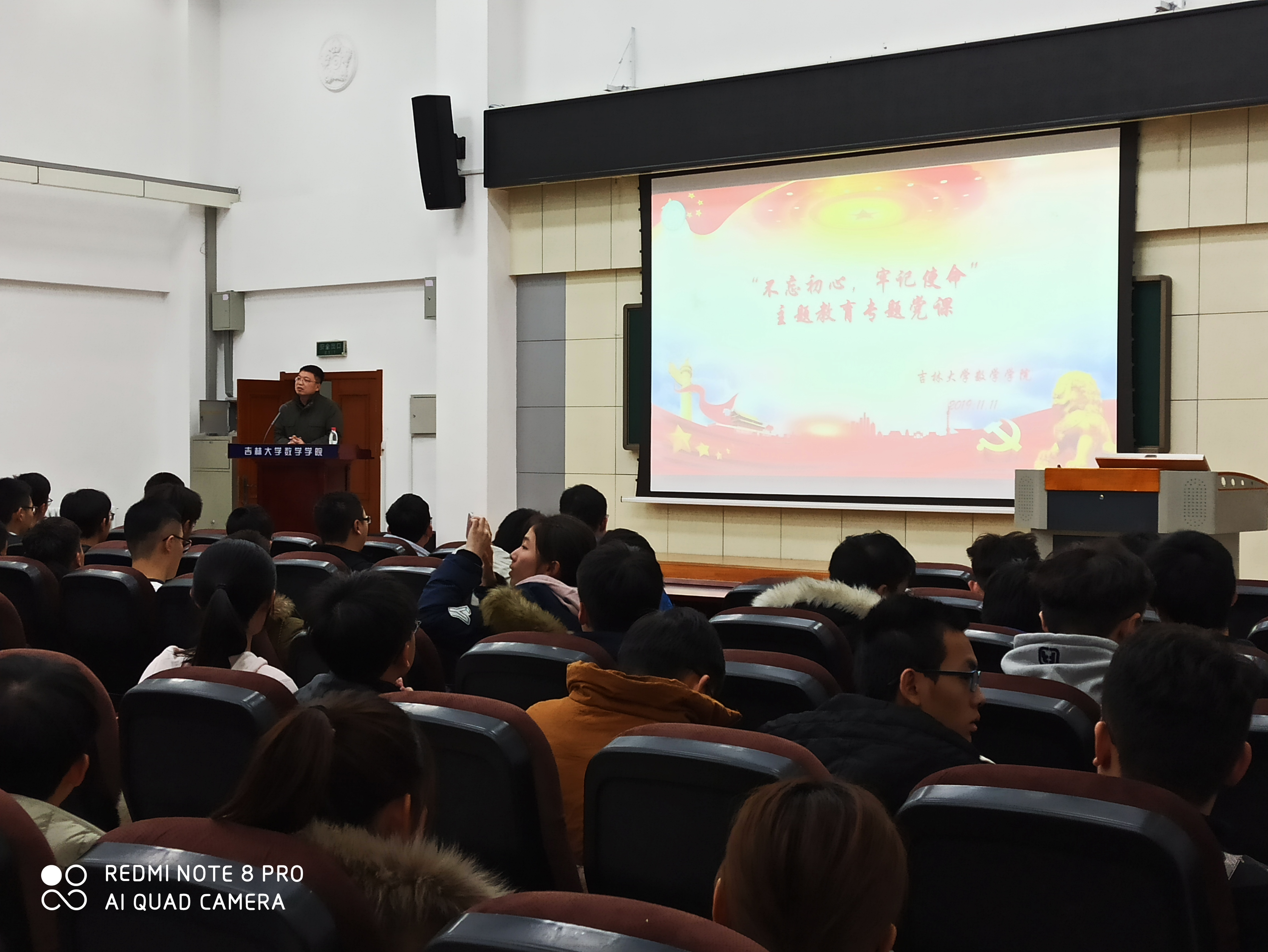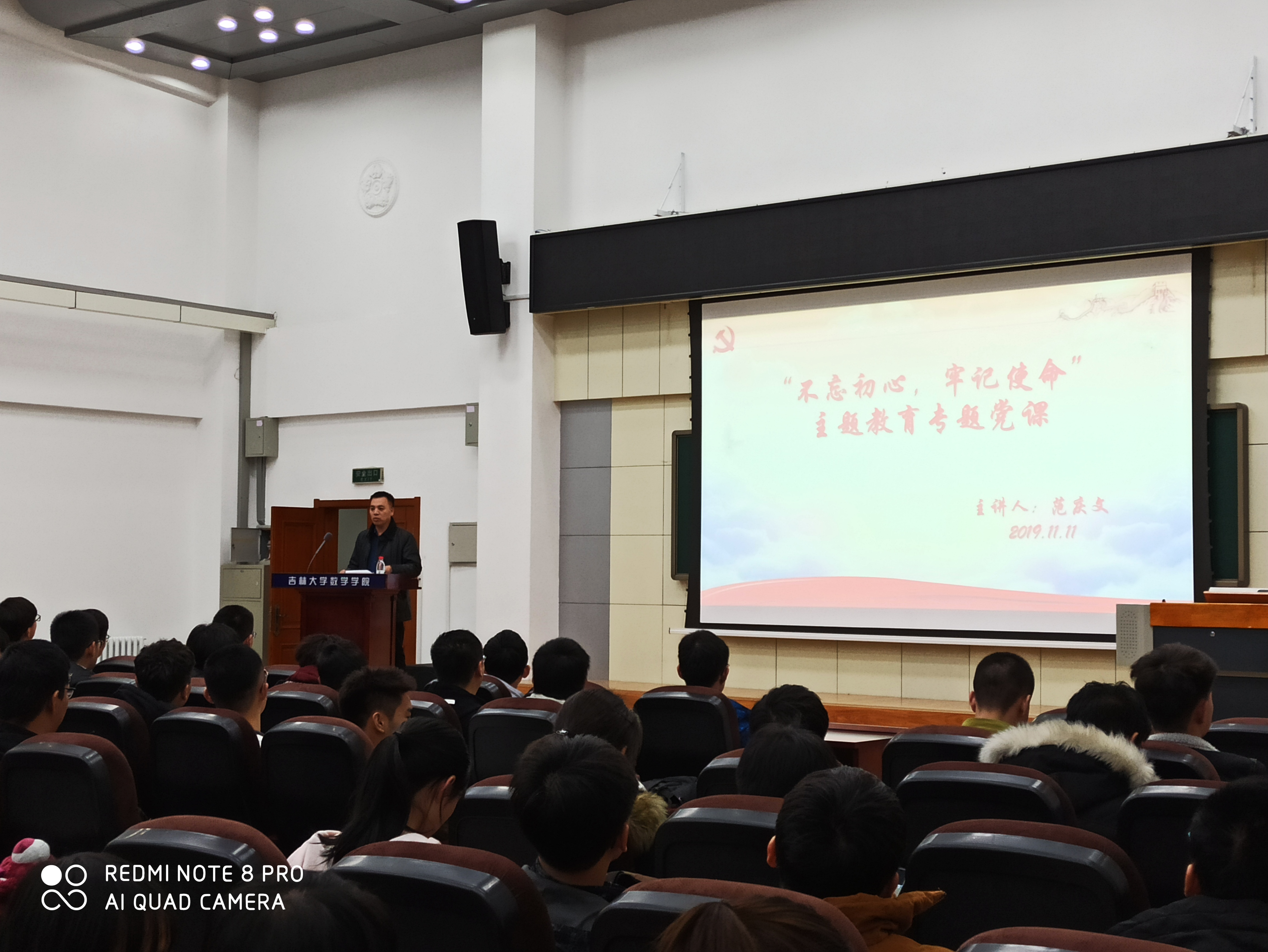 伟德国际1946副经理陈续升老师、党委副书记范庆文老师于2019年11月11日下午在数学楼二楼报告厅组织2017级同学开展“不忘初心,牢记使命”主题党课。此次党课旨在让同学们更加深入地学习和理解习近平总书记在中华人民共和国成立七十周年大会上的讲话,感受祖国七十年沧桑巨变,坚定同学们努力奋斗的决心。