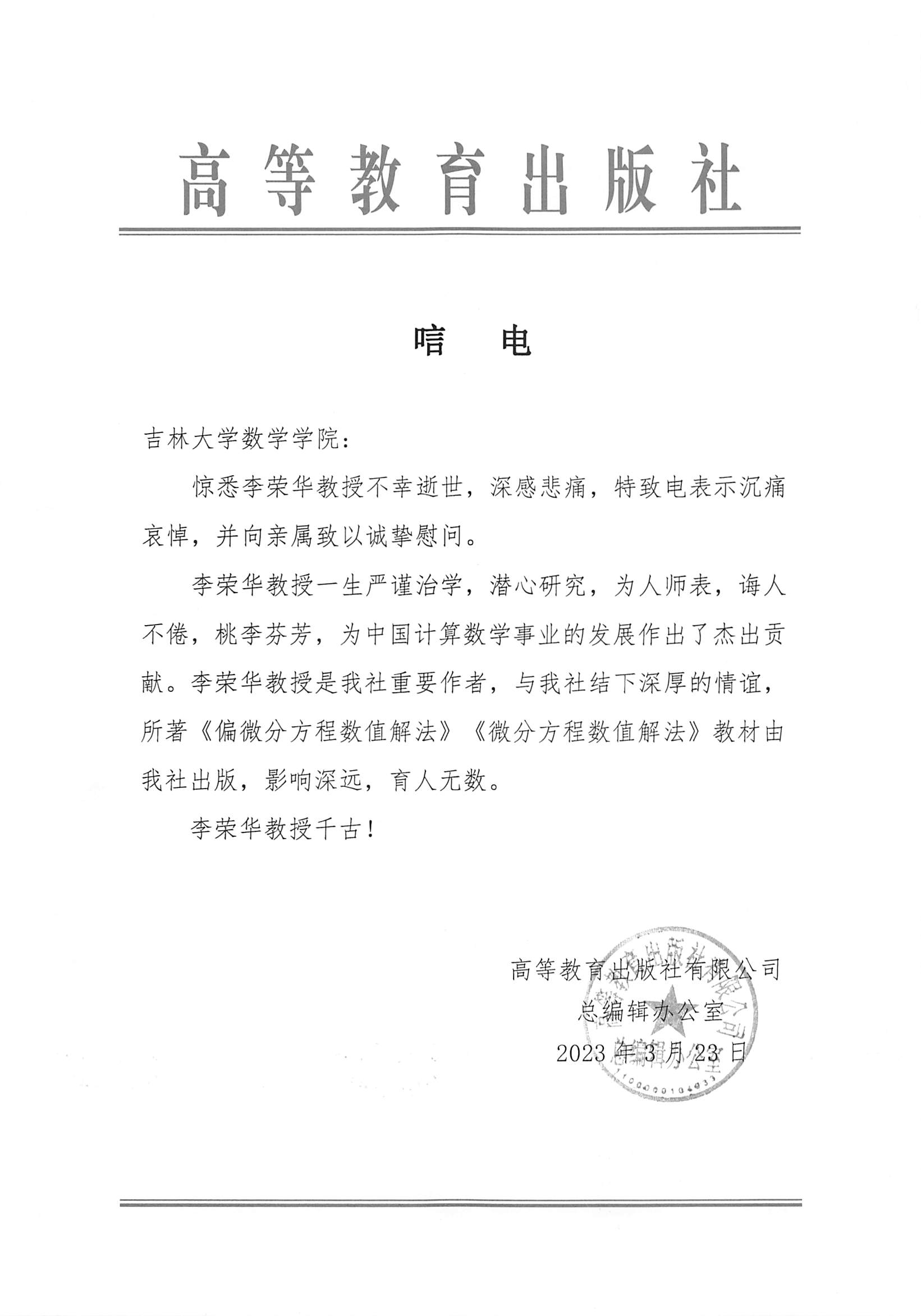 高等教育出版社唁电