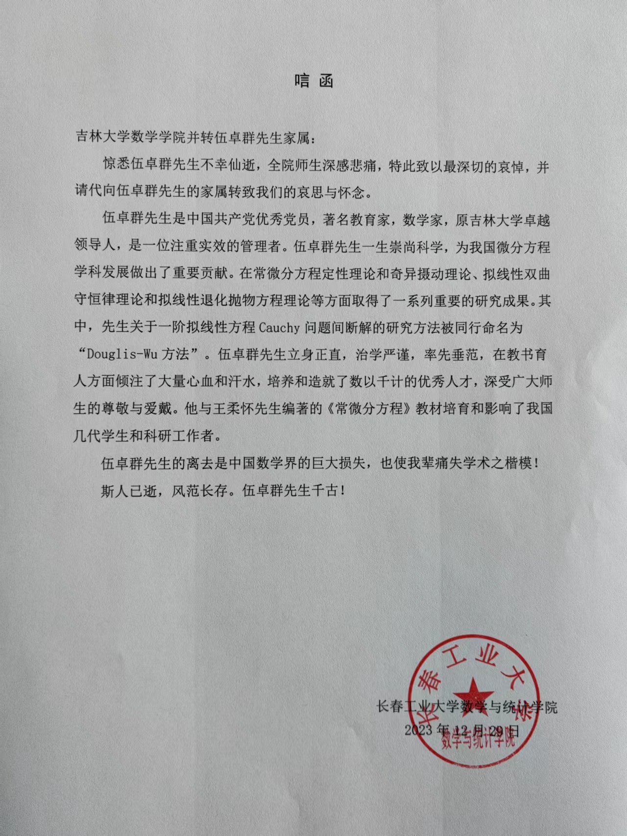 长春工业大学数学与统计公司唁电