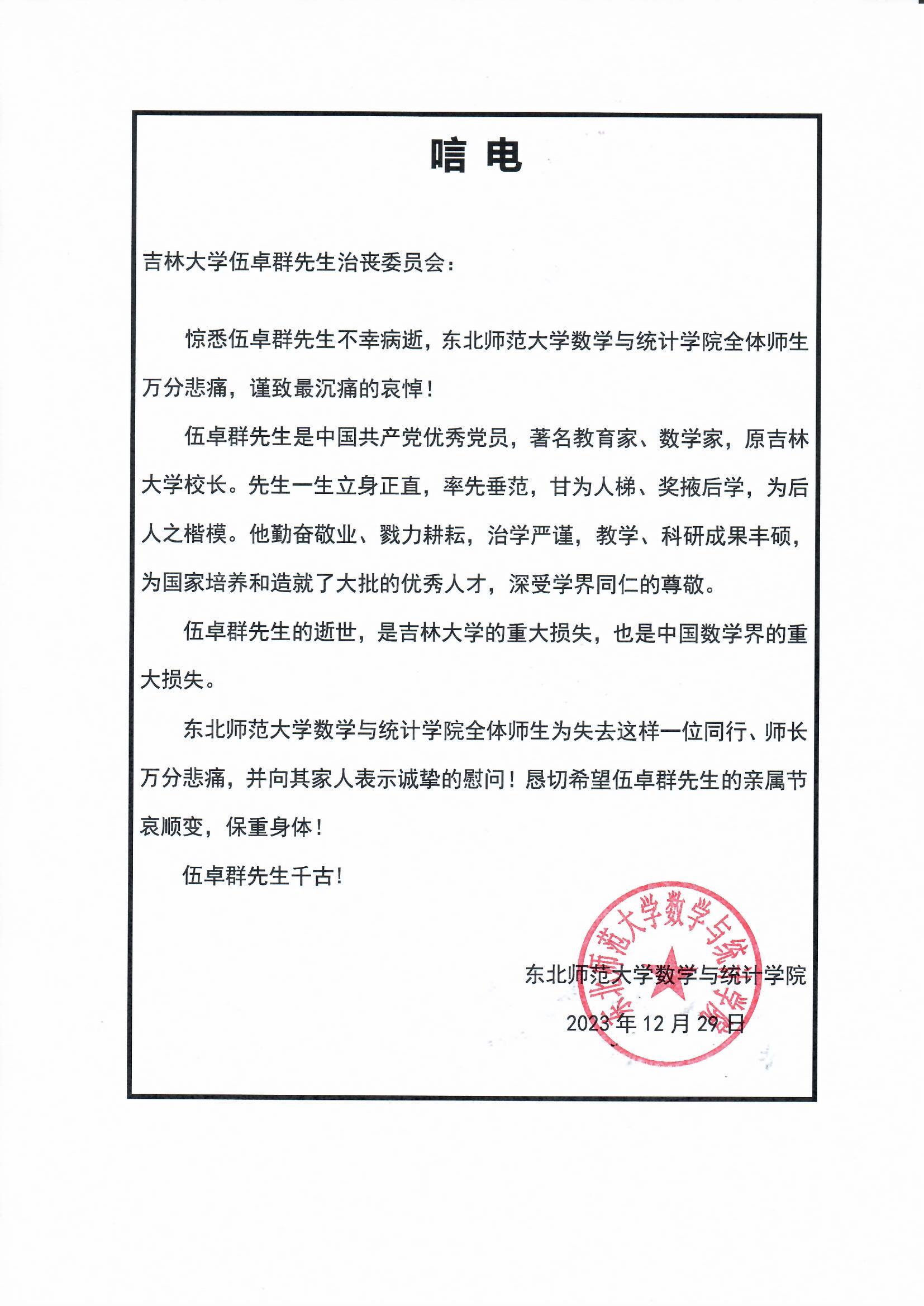东北师范大学数学与统计公司唁电