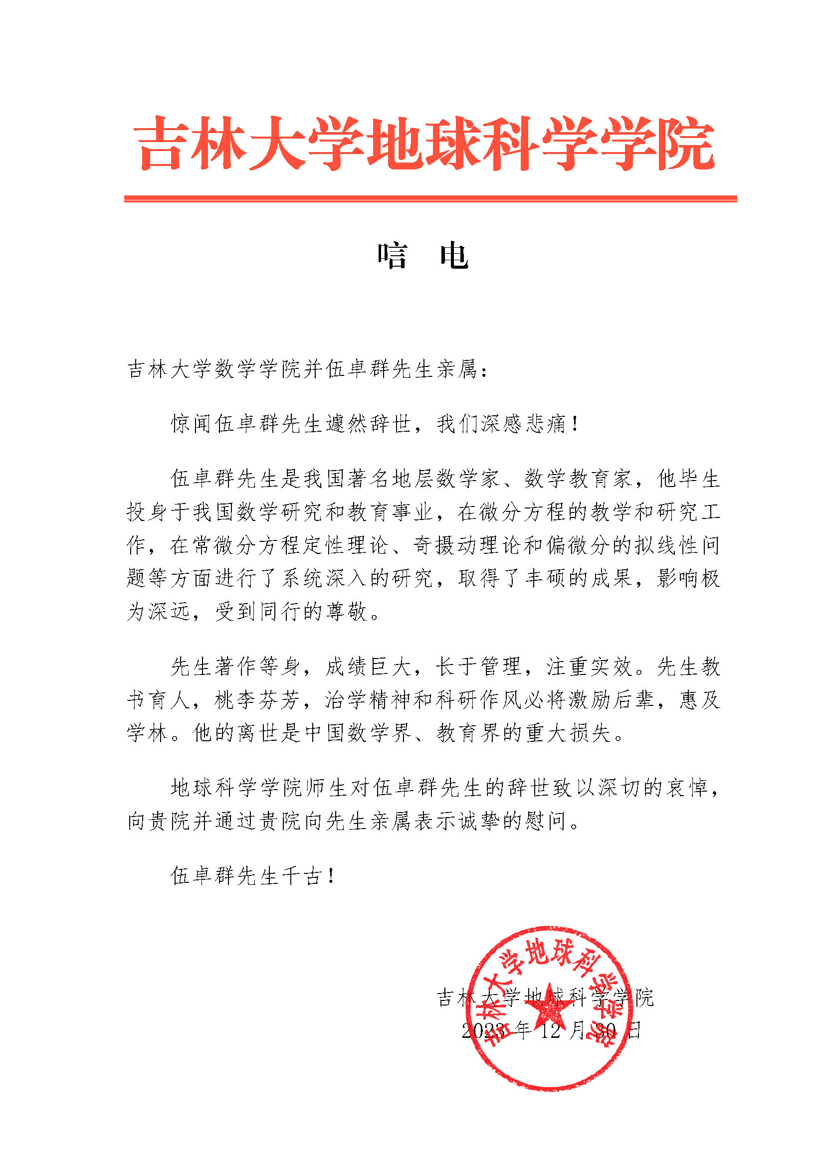伟德国际1946地球科学公司唁电