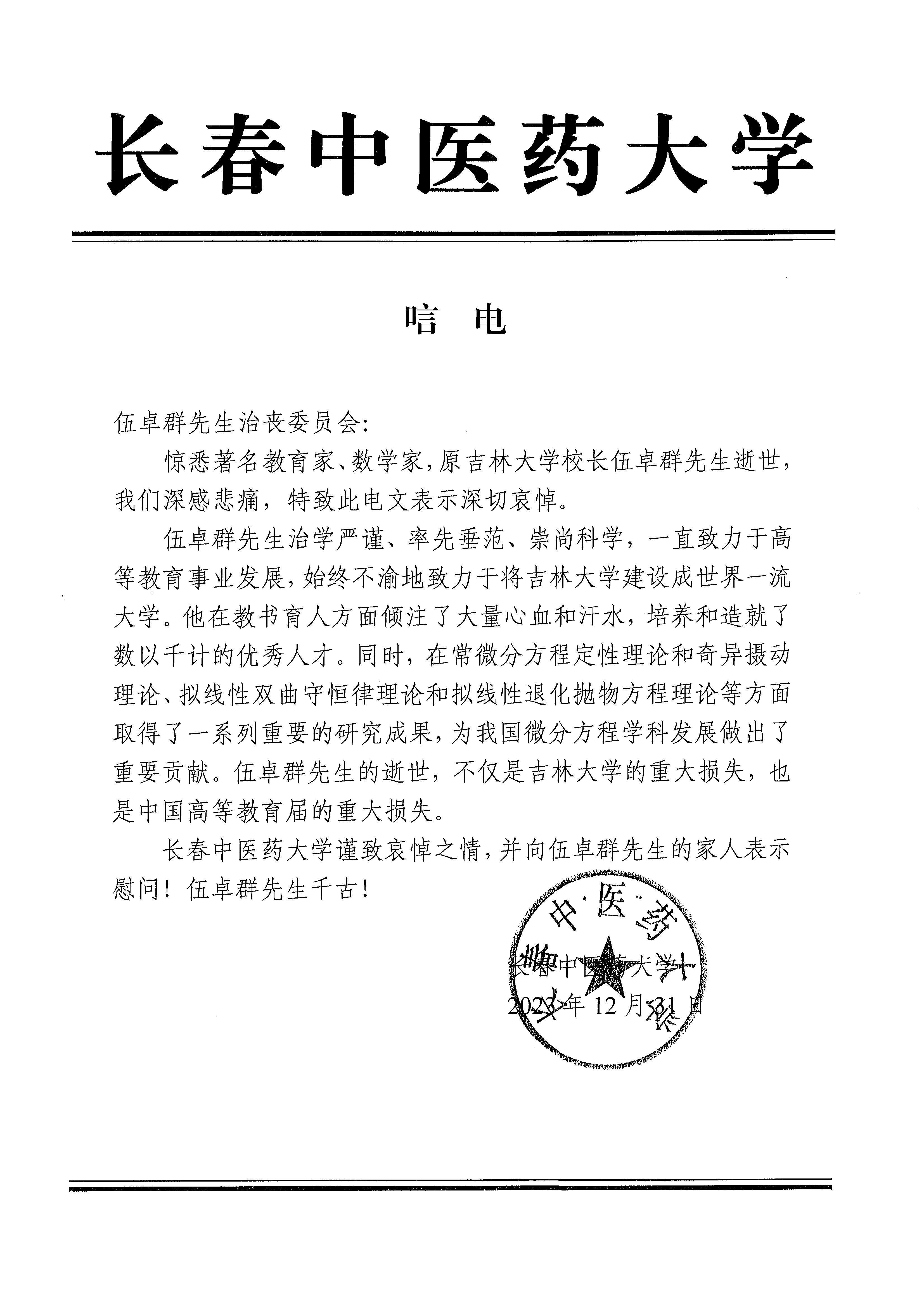 长春中医药大学唁电