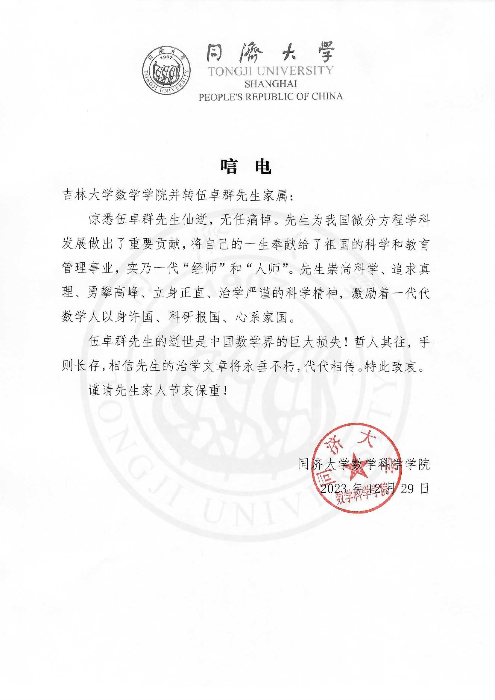 同济大学数学科学公司唁电